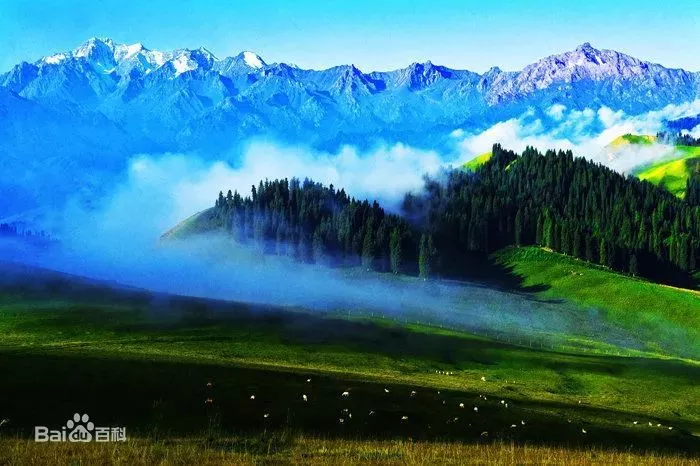 这里一向是哈萨克牧民的冬牧场,草原开阔,水草丰茂,周围峰峦叠嶂,满山苍松翠柏,一派郁郁葱葱。偶有一两顶白色牧帐点缀其间,那袅袅升起的炊烟,那悠扬委婉的牧歌,更增添了景区的诗情画意。当地哈萨克牧民的许多娱乐盛会诸如阿肯弹唱、赛马、叼羊、姑娘追等,常在这里举行。