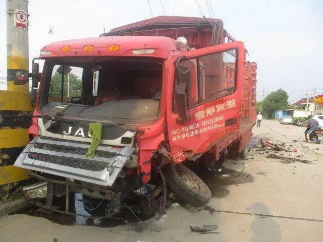 大货车两个前轮折断掉落,前挡风玻璃整体掉在车前,前脸部位只剩框架,整车扭曲前倾。