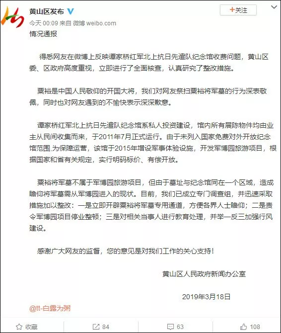 (观察者网讯)3月17日,有微博网友称近日赴安徽黄山瞻仰粟裕将军墓,但墓园所在的红军北上抗日先遣队纪念馆竟然收费95元。19日凌晨,中共黄山区委黄山区人民政府信息办公室官方微博@黄山区发布 发布情况通报称,立即进行全面核查,研究整改措施,责令军博园项目停业整顿。