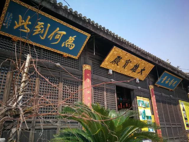 大雄宝殿面阔五间,系砖木结构,面积450平方米,双重复檐,檐下斗拱密致。歇山式屋顶,覆盖黄琉璃瓦,翼角悬铃,随风作响。殿内正中塑释迦牟尼、阿弥陀佛和药师佛三尊大佛像,高6米,全身贴金。