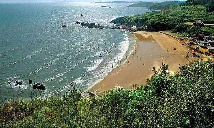 浴场海滩长1公里,海滩铺满卵砾石和金色沙砾,洁净而软硬适中,沙质为细砂,分选较好,细砂级颗粒80左右,成份主要为石英,其次为长石碎屑。海岸是岬湾型与堆积海湾的复式海岸。距海岸1里处正北方向有一块大礁石,礁石上由当地政府出资修了两座塔。在夕阳的照耀和海水的映衬下,景色格外优美,被称为“双塔夕照”。