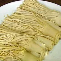 高碑店豆腐丝 河北 • 保定 • 高碑店 又名豆腐筋。产于河北高碑店。 采用伏地大豆为原料,经筛选、浸泡、磨浆、煮沸、除渣、凝固、压片、切丝、卤煮、捆把等工序制成。其中磨浆工采用大浆细磨法,用细纱布过滤,制成品质地纯净,拉伸有力,食之筋道;卤煮配料有花椒、肉蔻、大料等,使用火候及时间掌握适当,色、味入丝而不软、不断,故其色正味香,丝条整齐。色泽乳白,为成束丝状,味道咸香,最宜佐酒下饭。