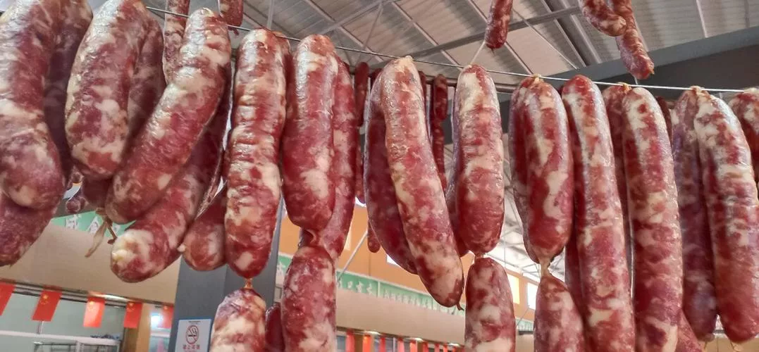 香肠 河北 • 廊坊 • 三河 系以新鲜猪大腿肉、肋肉、臀部肉、腰肉为主料,大多为瘦肉;肠衣为漂洗洁净无暇的猪肠衣;辅料有石落子、砂仁、香精、精盐、砂糖、纯高梁酒及陈年酱油等。先将肉料洗净去血,切成肉丁,加以各种佐料及调料,搅拌均匀,放置3小时左右,待料味入肉后再灌肠。每灌14厘米左右用麻绳结扎,边灌边扎,直至整条肠衣灌满,然后经恒温烘干而制成。 特点:成品色泽纯正,肠条饱满,粗细均匀,肥瘦适宜,香味醇厚,甜咸兼具,软滑利口,食之不腻,且耐久存。