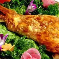 烤羊腿 河北 • 承德 • 围场 烤羊腿:选一年以内的羊,取下羊腿,在羊腿的正反面斜着划出花刀。放在炭火架上翻面烘烤,还要往羊腿上刷些调料。要用文火烤,不要用旺火和明火。等到羊腿变得深棕色并且冒出油即可食用。(提示:选择烧烤方法吃羊时,要挑选肥羊。)