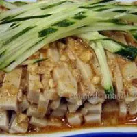 荞面灌肠是随处可见的小吃了,周边的县市叫“碗托”。制作方法是把荞麦面调成糊状,盛在容器里,上火蒸熟,冷却后脱离容器,叫“碗脱”比较形象。但从名小吃的角度看,灌肠才能说明问题的核心。正宗的或者说是做得好的,利滑爽口,有一种直下腹中,味进肠内的感觉。类似于酒,好酒感觉酒力能入脐,次一点的只能到膈了。假如不是这种差别的存在,那这种80年代在大街小巷都能吃到的小吃,也不至于能名列十大了。也可能是因为现在很难找到味道特别好的灌肠店,有的人就把六味斋酱肉归到十大小吃中了。(位于桥头街、钟楼街、柳巷交叉路口的“六味斋”酱肉店,原为开设于民国二十七年(1937年)的“福记六味斋酱肘鸡鸭店”,老字号的信誉早已深入人心。“六味斋”产品颇多,色香味俱佳,在众多的产品中,酱肘花独占鳌头。以“肥而不腻,瘦而不柴,淡而入味,香而醇郁”闻名。)