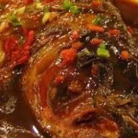 2)将炒锅烧热放入熟大油,葱(25克)姜(13克),炸香后取出,加入浓汤、鱼头肉、料酒盐,用小火烩10分钟左右,然后用湿淀粉勾芡;再改为大火将汤收浓,撒入胡椒粉即成。