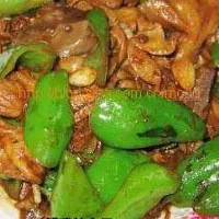 羊肠切段、辣椒切段,热锅凉油,将面酱炒一下,下大肠和大蒜煸炒,熟后出锅即可。