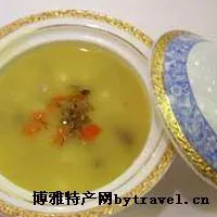 浓汤烩三宝 内蒙古 • 乌兰察布 • 察右中旗 浓汤烩三宝 “浓汤烩三宝”选取乌兰察布市的土特产土豆、莜面和羊肉为原料,经过特别调制的高汤烩制而成,其色泽浓黄,口味鲜咸浓香,入口爽滑,突显浓郁的地方特色,且价格适中,使买单者甚多。 该菜肴的关键在于调制汤汁的稠稀度,汤汁太稀就失去了浓香的美味,太浓则破坏了其口感。制作师傅把汤汁的稠稀度调制的恰到好处,使整道菜的美味发挥到极致,既传承了地方传统美食的制作工艺,又彰显了地方特产的神奇魅力。