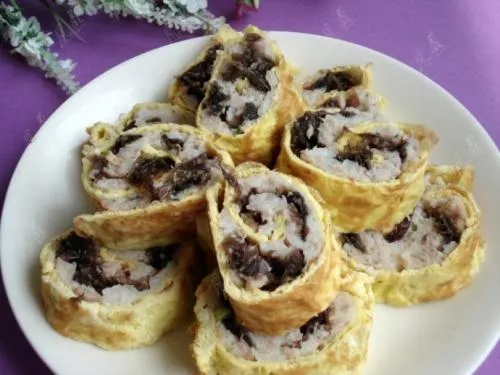 蛋皮鱼卷 浙江 • 杭州 • 富阳 原料:鸡蛋、鱼茸。制法:鸡蛋制成蛋皮,铺上鱼茸卷起改刀即可。特点:鲜香嫩滑,造型美观。推荐餐馆:杭州富阳宾馆地址:富阳市富春街道馆驿里18号订餐电话:0571-63349777( 富阳)