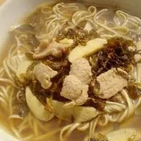 2.炒锅置中火上烧热,按份烧制,每锅下熟猪油15克后,放入肉片略煸,下笋片、酱油10克,煸炒约5分钟,放入雪里蕻,加入沸水50克炒匀,约5秒钟后起锅。原汤留用,锅内再加入沸水300克。在炒料的同时,将面条放入另一沸水锅内煮约1分钟,去除碱水,用竹笊篱捞起,控净水分,分成10份,每份倒入烧制配料的沸汤锅中煮2分钟,加入味精2克,浇10克熟猪油,盛入碗内,盖上雪菜肉片即成。