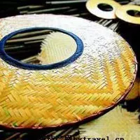 客家凉帽 福建 • 龙岩 • 上杭 客家凉帽已有1000多年的历史。凉帽用薄薄的蔑片或麦杆编成,斗笠的顶部缝着布,帽沿四周除正面外,垂挂着五寸来长的彩布,未婚的姑娘还要在垂布的两端挂五颜六色的彩带。彩带是客家姑娘婚否的标志。凉帽除了有遮阳、防雨、防尘的功能外,亦是客家妇女独特的头饰。
