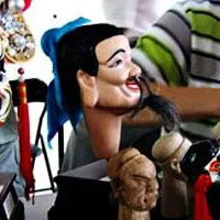泉州江加走木偶头:系艺师江加走(1871-1954)为地方流传的木偶剧种所制的雕刻艺术品。分提线与掌中两类。前者别称傀儡戏;后者别称布袋戏。全以手工制成。人物形象性格鲜明,艺术处理相当完美,颇具典型。如;媒婆,下巴可动,表现其能说会道,善于随机应变的特征。其制作,举凡头像、手掌、脚趾,均用质轻的樟榆木刻制。清乾隆年间,当地已有专营偶头雕刻的粉彩铺多家,“西来意”所制的提线偶头造型典雅为世所重,涂门街黄氏兄弟及其传人的作品亦著声誉,而集大成者当推江加走。其作品早年行销于台湾及东南亚华侨旅居地,部分销给闽南地区的木偶戏斑;新中国成立初,被列为国际交往的珍贵礼品。