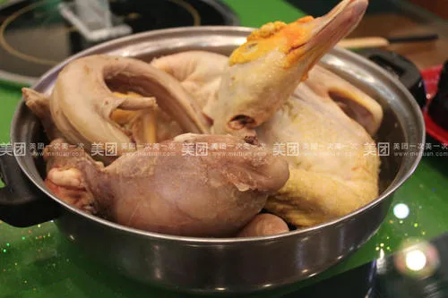 取新鲜番鸭腿肉剁成2~3厘米小块,取水发茶树菇切成寸长小段,在热油锅中加姜片、蒜头、食盐、味精等炒过,装入陶罐中,加汤盖盖子置炭火中煨2~3小时即可。特点是味醇厚、汤汁浓、肉鲜嫩、营养丰富。