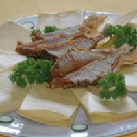 煎饼卷咸鱼 山东 • 济宁 • 微山 煎饼卷咸鱼是微山湖区民间传统家常菜,选用微山湖活水域出产的鳞色光亮发黄、形态肥美、肉质细嫩的漕鱼头,从胸、鳍处劈开,取出内脏,不用去鳞,放入盐、葱、姜、花椒腌上一天,煎时平锅注油烧热下入漕鱼头,煎至鱼身发挺,鱼香四溢,两面深黄时用煎铲取出盛入盘内,用湖区特产高梁煎饼卷而食之,颊颐留香。