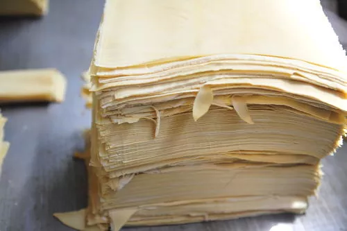 齐河豆腐皮 山东 • 德州 • 齐河 豆腐皮制做工艺与千层豆腐大致相同,其压挤水分的时间比千层豆腐更长,所以含水量极低,单页折叠为细长筒状,经压而成长方条,称坯子。坯子放入淡盐水锅内煮进咸味,取出晾去水分即成,大体0.5公斤10条(也有大包者如大夫营一带0.5公斤两条,且加酱色)。仁里集镇一带制作工艺精细,其皮子质地细嫩、口感好、有韧劲、薄如纸,备受青睐。