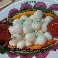 龙虾球 山东 • 东营 • 广饶 龙虾球 菜式配料 900克左右的大龙虾。 姜、葱、酒、精盐、味精、胡椒粉、鸡蛋清、猪朥、火腿、芫荽叶。 菜式制作 取900克左右的大龙虾,按生炊大龙虾的方法切好起肉,并把龙虾肉切成相等的十块,用姜、葱、酒、精盐、味精、胡椒粉、鸡蛋清拌均匀,略腌10分钟;猪朥网切小方块,上面放一小块火腿和芫荽叶,摆成花纹,再放上龙虾肉,包成块状,把龙虾肉、龙虾头、尾摆成龙虾状,上蒸笼用旺火炊6-7分钟,用原汁勾薄糊淋上。