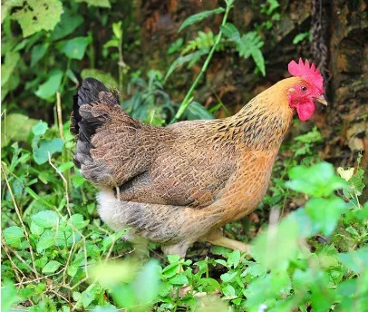 右,蛋大、皮红(枚重平均60克左右),适于储运。雄鸡,毛色艳丽,多火红色,颈、背两部毛长,