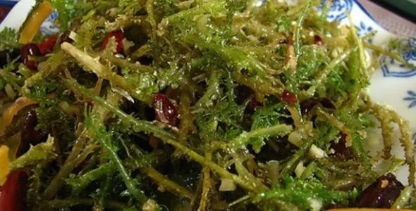 旧时因缺衣少食,物流不畅,沿海人往往以鱼代粮,以海藻为副食。食用的海藻五花八门,海蒿子、海麻线、海莴苣、海紫菜、羊奶子、冬毛菜、鹿角菜等海菜,变着花样吃。最后竟吃出了一道海边渔家很有特色的一道菜——猪头肉炖鹿角菜。此道菜口感绵软而爽滑,香儿不腻。因鹿角菜吸附性较强,猪头肉的油花全被吸到鹿角菜里,反过来鹿角菜的清香又使猪头肉别具风味。