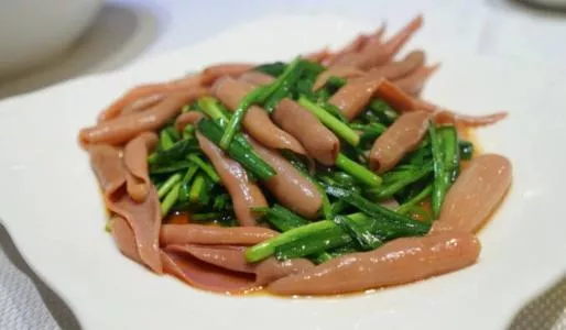 韭黄炒海肠子 山东 • 烟台 • 福山 【韭黄炒海肠子】福山传统名菜。海肠是一种生于浅海含有丰富蛋白质的软体动物。形似肠,为福山沿海所独有,经名厨精心创制,成为闻名的佐酒佳肴,备受各地食客赞赏。 其制法:先将海肠两头去掉,刮去内脏,切段寸半,用十成热油下勺一冲,将韭黄、海肠下锅略炒,加绍酒、食盐、酱油、翻匀,加芝麻油少许即成。炒成的海肠,色泽紫里透红,味道脆嫩鲜美。信息来源:山东省情网