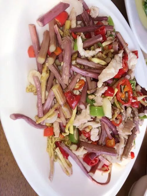 辣椒蕨菜炒肉丝 黑龙江 • 伊春 蕨菜,又叫作龙头菜、如意菜,因其嫩苗似拳卷曲,故又称“拳头菜”,是近些年逐渐受到大家喜爱的一种野生蔬菜。食用时,先用开水煮熟后,在用清水浸泡一二天,每天换清水数次后加油盐调料回锅炒肉,具有杀菌清毒的功效。伊春大小饭馆都吃得到,20元左右一盘, 不过脾胃虚寒者慎用,常人也不宜多食。