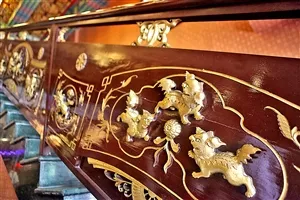 三狮滚绣球。将藕丝、肉丝、鱼丝系在一起炸成空心球状,盘中放一雕龙,如群珠戏龙。