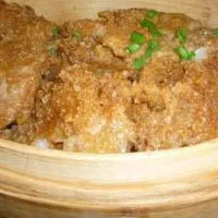 “粉”的制作,最好是选用早稻米,因为它不粘连,再加上一点糯米,使蒸熟的粉不散。这样,蒸好的肉片表面就没有粘连的稀糊状。至于“粉”中的配料,师傅说要保密。但他仍告诉我:不能把配好的“粉“直接倒入揉拌好的肉中,只能一片片地把肉放到“粉”里滚一下,让肉自然地粘上粉,再在碗里摆放好,就可以蒸了。