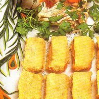 【菜名】 锅贴鱼 【所属菜系】 湘菜 【特点】 色似金黄闪光,鱼片腊香鲜嫩,临食蘸上椒盐,更显味道特佳。 【原料】 主料 青鱼肉200克,肥膘肉100克,火腿米50克,香菜末50克,鸡蛋1个,玉米粉适量。调料 植物油100克,香油25克,湿淀粉30克,料酒18克,味精2克,盐2克,椒盐少许,葱末10克,姜末10克。 【制作过程】 (1) 把青鱼肉和肥膘肉片成同样大小(鱼肉厚0.6厘米、猪肉厚0.3厘米)的4大片。 (2) 用盐、味精、香油、鸡蛋(多半)、料酒、葱末、姜末等分别煨好。(3) 用肥膘肉铺底,上面撕玉米粉,用少量鸡蛋、湿淀粉调成稀芡糊,在鱼片上挂上一层,然后放在猪肉上,中间撒上火腿米,两边撒上香菜末。(4) 炒勺内倒入植物油(50克),用文火烧热,猪肉面向下,放入勺内煎。(5) 移入旺火,倒入余量油炸至金黄色,捞出后切成小片,整齐地码在盘内即成。