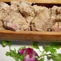 因粉蒸肉大多选用的是五花肉,偏油腻,不太适合那些肠胃不好的人,因此,将其改用嫩排骨,以新鲜的楠竹筒,锯留成节笆,通小孔,灌上菜料,再加香佐,开大火蒸,熟后有种竹香的独特。上桌时,当着食客的面剖开竹筒,以示原竹原料,原汁原色,原香原味,乡野清气伴着竹香而入口,让身居闹市的你烦厌之气顿消,潇湘灵气顿生。