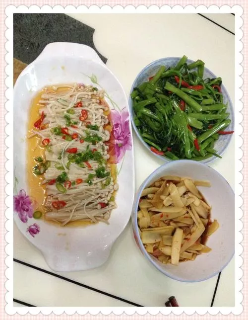 后撇去浮沫,再放入小白菜,慢炖五分钟后,加入味精,淋香油,即可。特点:色泽鲜艳、软嫩酥烂、清鲜适口。2、罗汉斋全料:水发冬茹50g、鲜蘑菇50g配料:水发黄花菜25g、