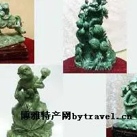 该工艺品是以南玉为原料雕制而成。其中以仙桃、葡萄盆景著称。它以天然翠绿南玉作叶子,淡绿透明的玉石作果桃,经过巧制,造成一个个熟透泛红的仙桃,一串串熟透发紫的葡萄。这些盆景,有的枝叶繁茂,含苞待放;有的果实累累,栩栩如生。1986年1月,0中央总书记-视察信宜时,观赏了各类玉器工艺美术品,对其中取材《西游记》中“蟠桃会”的特大玉石盆景深感兴趣,他赞说:“真是从古到今第一啊!”