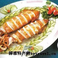 炸荷包鲜鱿 用料: 鲜鱿鱼2个约600克,糯米100克,叉烧肉50克,湿香菇10克,肥猪肉25克,虾米15克,熟莲子25克,青葱20克,生柑1个,味精5克,鱼露15克,胡椒粉0.1克,麻油2克,酱油,湿粉少许。 制法: (1)将鲜鱿头拉出(不要开刀),内腹冲洗干净,并将外膜脱净待用。 (2)先将糯米洗净,加少量水炊成糯米饭,然后把叉烧肉切成细粒加入。香菇、虾米、肥肉、莲子等分别放入鼎炒过,再调入味精、鱼露、胡椒粉、葱粒、麻油等制成八宝饭待用。 (3)将八宝饭料塞进鲜鱿筒内面,同鲜鱿头一起放入蒸笼炊3分钟,取出后用酱油和湿粉抹在鲜鱿筒内外面,鱿鱼头也同样抹上酱油、湿粉一起放入油鼎炸至呈金黄色,取出用刀切成若干块,砌成鱿鱼形状摆于盘中,淋上胡椒油,盘四周拌上柑片点缀即成。 特点: 鲜鱿原状,郁香味浓。