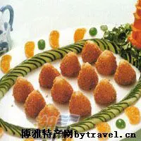 干炸蟹塔 用料: 鲜蟹肉400克,肥猪肉75克,瘦猪肉125克,鲜虾肉10克,鸡蛋l个,韭黄20克,荸荠2个,蟹壳12个,生油750克(耗100克),味精、精盐、胡椒粉、干雪粉、面包麸各少许。 制法: (l)将蟹壳洗干净,用开水烫软后,才用剪刀剪成直径3厘米宽的圆形壳24个待用。 (2)把瘦肉剁碎,肥肉、韭黄、荸荠都切成细粒,鲜虾肉打烂加入味精、精盐、胡椒粉、鲜蟹肉和鸡蛋白用筷子搅匀,然后分成24件,砌在已剪好的蟹壳上面,用手捏成顶尖下大的塔状,蘸上薄干雪粉,摆进盘里,放入蒸笼炊10分钟取出。 (3)将油下鼎烧热,把炊好的蟹塔粘鸡蛋液后,蘸上面包教放下油鼎溜炸,约2分钟后,则呈淡黄色即用笊篱捞起,盛入盘中即成,并要彩盘。上席时配上浙酷、汁各2碟。 特点: 色淡黄,肉质鲜嫩,外带酥香,是秋季佳肴。