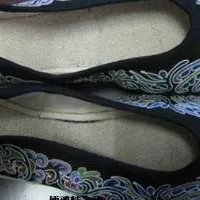 “回头”绣花鞋为妇女常穿用。鞋头有钩,象龙船。分有后跟和无后跟两种,鞋底较厚,多用砂纸作成。针法有齐针、拖针、混针、盘针、堆绣、压绣等。在色彩上,年青人喜用亮底起白花,有石榴红、深红、青、黄、绿等色彩,纹样有龙纹、双狮滚球、蝶花、喜鹊等;老年人多用黑色、浅红、深红等色,纹样有云、龙、天地、狮兽等。这里展出的是壮族家居“回头”女绣花鞋。鞋尖呈三角锥状,尖部呈“回头”状。鞋面为蓝布,上有用黄、红、绿线绣成花草图案。鞋底为用麻线纳的千层底,针脚细密,坚固耐穿。
