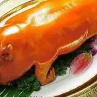壮家烤乳猪 广西 • 崇左 • 扶绥 壮家烤乳猪是崇左壮族的特色菜,广西的传统佳肴,不过各地的选料、做工和用料不同,所以风味也略有不同。乳猪需用糯米或大米喂养, 使其肉细皮嫩为上,一般选用未断奶的四公斤左右的乳猪为佳,剖腹后将猪腔撑开,风干后放在炭火上烤,一面烤一面将其两面翻转,同时抹上酱油、蜂蜜等香料加工烤制,使其皮色呈金黄,敲击时声音清脆,此时肉质细软爽口。食用时将其履于盘中,以刀切成小块,拌以黄皮酱、白糖或酸甜酱食之,入口酥脆,难以停筷,食后口有余香,真是一大美食。