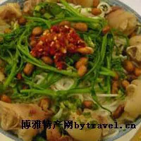 作为桂林米粉家族中的一员,兴安猪脚米粉可谓是其中的豪放派。它与其他类型的桂林米粉一样,用的是新榨出的新鲜米粉和切粉,与众不同的是,其一改肉类佐料的片状、丁状、泥状风格,猪脚以较大的块状堆放在碗中的米粉之上,耀眼夺目,这很默契地应和了兴安人“大块吃肉、豪爽做人、大胆谋事”的人文性格。