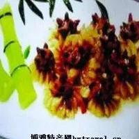 3.将牛鞭菊花放在盘中,顶部逐个酿上鸡茸,并插上枸杞成梅花型,加高汤上笼蒸约4分钟取出装盘造型。