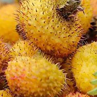 刺梨,属蔷该科蔷该属植物,野生于贵州境内的有普通刺梨和“搭钩刺梨”(即无籽刺梨)两个种,普通刺梨种中又有两个变种,一为“光皮刺梨’,一为“送春归”。 刺梨为野生小灌本,四至六月开粉红色、红或深红色的花,夏花秋实。果实多为扁圆球形,横径一般为2-4厘米,8-9月果实成熟,黄色,有时带红晕。果肉脆,成熟后有浓芳香味。果皮上密生小肉刺,俗称之为“刺梨”。果实内含有丰富的维生素C,每百克鲜果的可合部分一般含维生素C二千毫克;单宁五百至一千毫克;含酸一至二克;总糖量一般四克左右。 刺梨原产我国西南部,以贵州最多最好。据《黔滇纪游》云,刺梨野生,夏花秋实,于与果多芒刺,味甘酸,食之消闷,煎汁为膏,色同楂梨,四封皆产,移之他境则不生。《巢经巢全集》中,有"田评香稻久,路摘刺梨频"的诗句。晚清贵州诗人莫友芝咏刺梨有“形模难适眼,风味竞舒眉”的名句。刺梨果实肉质肥厚,富于营养,每当刺梨成熟,黔滇居民,除去其刺,或生吃、或糖渍、或提其香味以作酒,或晒干而入药。初嚼时昧酸而涩,是后渐变甘旨,市价极为低廉。 本世纪四十年代初,我国著名营养化学家罗登义教授,发现刺梨果实中含有极其丰富的维生素C和P,誉为水果中的"维生素C大王",在省内广泛流传着"一个刺梨的营养价值相当于三个鸡蛋"的美谈。正常成年人每天吃半个刺梨,即可满足其维生素C和P的生理需要。据研究证实,刺梨鲜果的维生素C含量远远高于其他任何水果,是猕猴桃的10倍,沙田拍的18倍,甜橙的50倍,红桔的100倍,梨子、苹果的500倍。用刺梨制成的果汁、清凉饮料、果酱、果酒等各种加工食品,不仅营养丰富,味美可口,并且能保持高含量的维生素C,是航空、航海、高原及采矿等特种作业人员和老弱妇幼的重要营养食品。