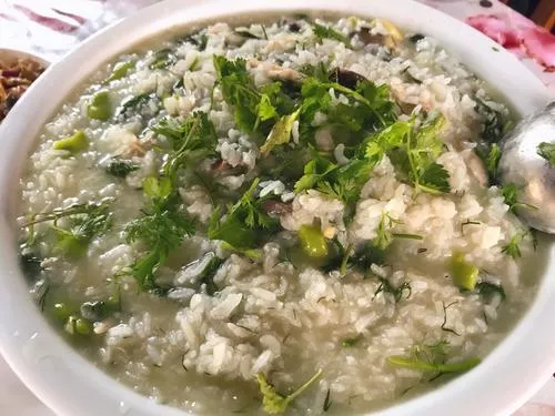 小鸡煮稀饭,是佤族普及面最广、节庆或待客的最佳粥品。佤族地处云南边境山区,聚族而居,民风古朴,尊老爱幼,待客如宾。食俗粥上桌后,鸡头必须昂立粥中,由主人将鸡头献给最尊贵的客人或年长的老人。客人应笑脸相接,不能拒绝,亲日品尝。吃此粥时,必饮低族传统水酒,其乐融融。尝粥,五味俱全,鲜甜滋润,饭菜合一,滋补强身,尤宜老幼体弱者食用。有养肝、滋阴降火,增加奶汁之效。