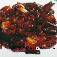 烧黄鳝 云南 • 红河州 • 红河县 烧黄鳝,是红河县彝族支系卜家人的传统名菜。是用烧熟的黄鳝炒熟而吃,麻辣干香,鲜美爽口。 卜家人捕捉黄鳝十分有趣。刚收完早稻,翻田搭埂,每当夜晚,一条条又肥又壮的黄鳝从泥土中钻出来,躺在泥土上休息。这时,卜家青年们一个个腰间系着鳝箩,举着火把,握着竹钳捕捉黄鳝。一些捕鳝能手一夜可捉到七八斤。回家后放入火塘的子母火中,活生生的黄山变成了圆圈似的鳝卷。然后把鳝鱼串在竹竿上,逢年过节或家里来客,便成了首选荤菜。