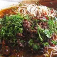 凉拌米线 云南 • 昆明 凉拌米线是云南昆明的地道美食。其配料有爆香花生末,炒过的芝麻粒,烫熟的韭菜、木耳和豆芽菜,新鲜青笋切丝,切块土鸡;作料有甜酱油、咸酱油、蒜水、麻油、芝麻酱、花生油、酸醋、姜汁,辣椒油等,和当天生产的米线拌在一起,新鲜又美味。