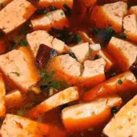 辣子豆腐 流行于县西南的路井、独店、孟庄一带。先把豆腐切块放入带调料的汤中煮20分钟;再煎好"哨子"。内容有油炸豆腐、萝卜丁、莲菜丁、肥肠等;再烧好猪油、清油相搀合的油泼辣子,只取上部辣子油备用。吃时先舀豆腐,再搭梢子,最后淋上辣子油,味美可口,有"宁吃一碗辣子豆腐,不吃十碗席"之说。