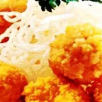 木棉虾球 陕西 • 西安 • 未央 陕西省古典名菜。原属西汉宫廷菜,后传入市肆。基本制作工艺是,将虾处理干净,虾身片成两连刀,用料酒、精盐、葱片、姜片浸腌入味。挂上用鸡蛋清和干淀粉制成的蛋泡糊,成为虾 桃。下入四成热的熟猪油锅中炸熟,盛入大圆盘中。菜松摆在虾桃周围。炒锅中留底油,加入番茄酱、白糖、高汤进行烹汁,浇在虾桃上即成。 其特点是:色泽艳丽,形似棉桃,鲜嫩松软,昧甜略酸。是一款营养丰富的高蛋白质菜肴,且有补肾壮阳的功效。( 西安)