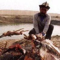 罗布人烤鱼 新疆 • 巴音郭楞 • 尉犁 罗布人烤鱼 罗布人与荒原为伴,生活习俗也充满了荒原的特征,粗犷、原始、具有非凡的忍耐力和适应性。罗布人的饮食主要以烤鱼为主,罗布人围火堆烤鱼已经成为其一大特色。罗布人的萨特玛(房屋)古朴随意,建筑独特,通常在海子(湖)边找一棵大的胡杨树,以树冠为屋顶,集红柳、芦苇、树条编插成一棚茅屋。罗布人出行不骑马和骆驼堪称一绝,仅凭一叶罗布舟(维吾尔语“卡盆”,独木舟的意思) 便可在海子连片的村寨间穿梭自如。