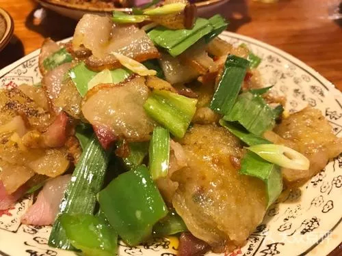 腊肉粉粑粑 重庆 • 城口 • 城口 腊肉粉粑粑:先将洋芋去皮洗净,把洋芋放在长方形蜂窝眼的背面用力上下滑动摩擦,在摩擦过程中偶尔加点水,这样擦出来的洋芋粉易溶解于水中,慢慢沉淀于器皿底部。把菜油放入锅中烧至六成热左右,在淀粉里加入适量的鸡蛋和水混合,慢慢倒入锅中不停地搅伴,逐渐摊开成皮,皮的厚度一般应掌握在硬币左右的厚度即可,将皮的两面反复的进行煎炕,成型后出锅切成方条形待用。将切好待用的腊肉片倒入锅中翻炒,直至油水沥出,肉片卷曲,准备少许葱,生姜,食盐和粉皮一起倒入翻炒,再放入青椒,炒至粉皮白中微黄,出锅时放入蒜泥效果最佳