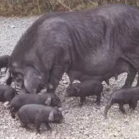 黔北黑猪体型较大,成年公猪体重79~92千克,母猪为66~86千克。黔北黑猪全身被毛黑色,少数个体蹄部、尾部末梢、鼻盘等有“白点”特征。嘴长而直,背腰微下凹,较长而窄,腹大下垂但不着地,怀孕母猪腹部可以着地。黔北黑猪性成熟较早,公猪在3~4月龄就开始用于配种,母猪初情期平均在108.5天,一般在133.8日龄时开始初配,经产母猪每窝产仔数为7.57头。黔北黑猪主要产区是遵义。