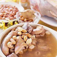 花生猪脚汤 香港 • 香港 • 香港 配料:生花生250g、猪脚1支、红枣12个、当归15g、丁香5g、葱段10g、姜片10g 制作方法:1、猪脚洗净从中间分开成两半,在沸水中略微烫一下,冲洗清理浮末。2、花生洗净,大火煮开后用小火煮到约7分熟,放入猪脚继续文火煮。3、待猪脚煮到1小时后约8成熟,放入红枣、当归、丁香、葱段、姜片。4、继续用小火煲煮,大约3小时,待猪脚熟烂,汤汁也变得粘稠即可。