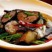 武冈猪血饼炒腊肉是武冈传统美食,以武冈猪血饼、武冈腊肉制作而成,腊香味浓郁。