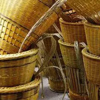 土家背篓 湖南 • 湘西州 • 龙山 土家背篓为龙山县土家民族竹制手工艺,其编制精巧,造型美观而享誉省内外,并最具民族特色,上下沿口和中腰缀以黑、红、绿彩篾、上大下小,小巧玲珑,色彩鲜艳,尤以小背篓最为出名,已成为走俏的旅游纪念品、年销量在10万件以上。