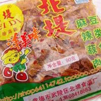 北堤麻竦菽肉由优质黄豆精制而成,黄豆经高温膨化为植物蛋白肉,又经油炸并调味而成。味麻竦鲜美,深受本地老百姓的喜爱。本品也可以拌入粉面中,味佳。麻辣肉是常德的特产,名字带个“肉”字,却是一种豆腐皮制品。过去常德有很多牌子的麻辣肉,而唯独北堤麻辣肉口感独特、余味无穷,风行常德数十年仍然很受男女老少的喜爱。有机会到常德旅游的朋友一定要尝尝,否则算是白去。
