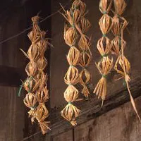 南郑县新集镇一带的农村里,不少人家的墙壁上,屋沿下的阴凉通风处,挂着一串串用稻草裹着熟食辣豆豉,它是主人招待亲朋好友时的一道名菜。